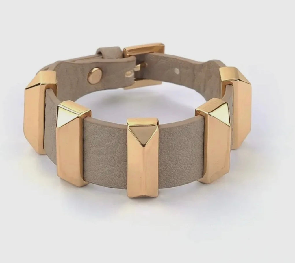 Cuff: Taupe Vegan Leather with Gold accents. Adjustable to fit any wrist.